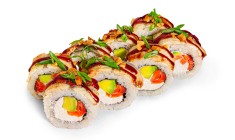 Лосось, тигровая креветка, копченый угорь, сливочный сыр, огурец, соус унаги, кунжут