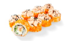 Снежный краб, сливочный сыр, огурец, соус для запекания, соус терияки, икра масаго