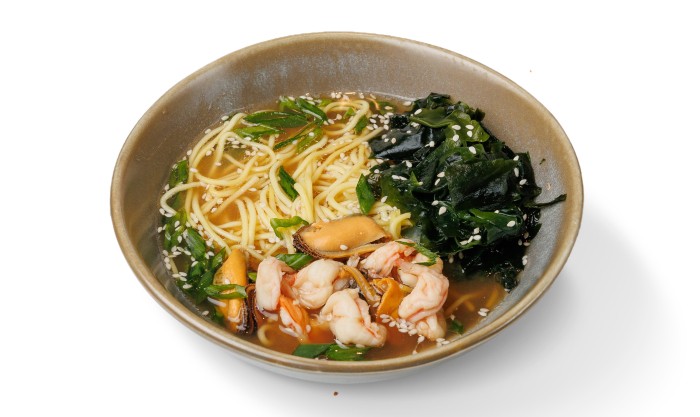 Бульон мисо, креветки тигровые, мидии очищенные, яичная лапша, водоросли вакамэ, кунжут, зеленый лук