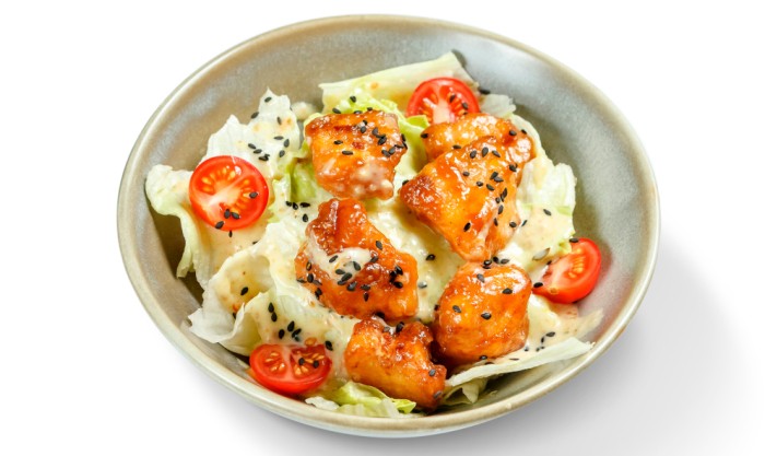 нежные кусочки куриного филе в воздушной панировке, карамелизированные в кунжутно-соевом соусе, салат Айсберг, томаты черри, соус ореховый ананас-чили, кунжут, криспи с паприкой