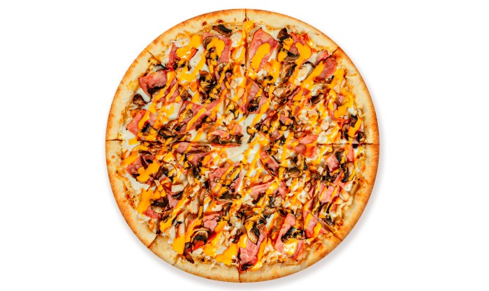 Соус Цезарь, ветчина, обжаренное куриное филе, шампиньоны, сыр моцарелла, сыр чеддер