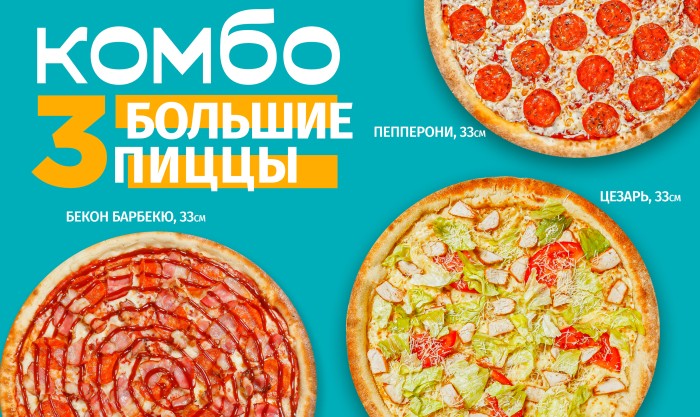 Пицца Пепперони 33 см, Пицца Бекон барбекю 33 см, Пицца Цезарь 33 см