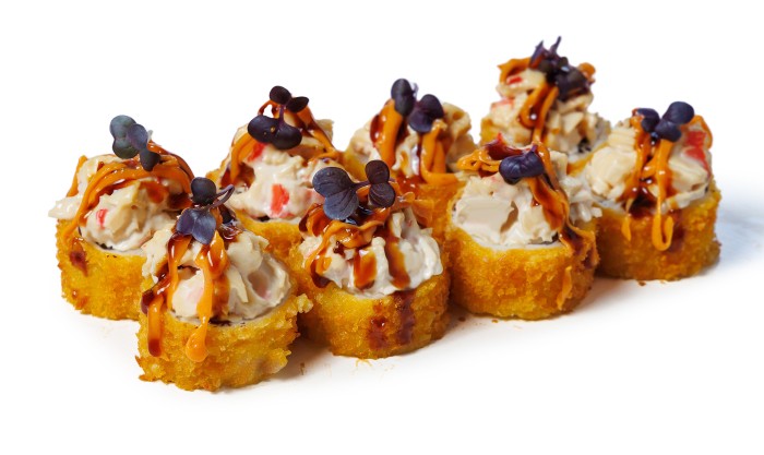 Снежный краб в соусе гурман под соусом унаги том-ям, японский омлет, огурец, хрустящая панировка, микрозелень