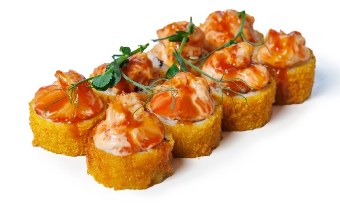 Лосось в соусе гурман под соусом терияки манго-чили, японский омлет, огурец, хрустящая панировка, микрозелень