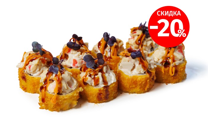 Снежный краб в соусе гурман под соусом унаги том-ям, японский омлет, огурец, сухари панко, микрозелень
