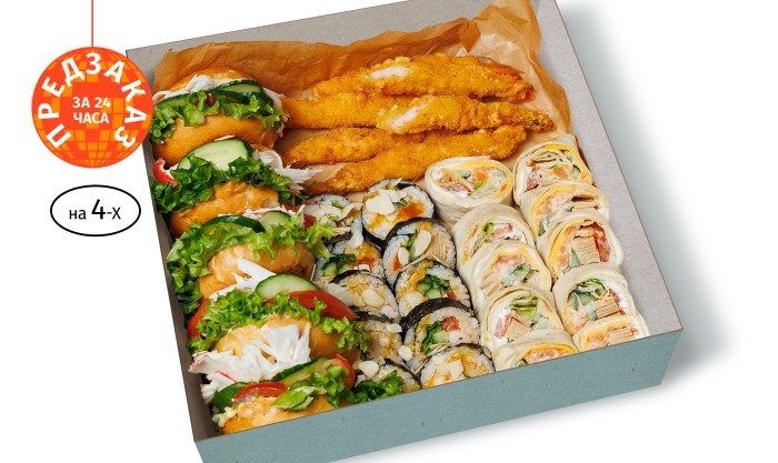ПРЕДЗАКАЗ на завтра. Кимпаб с креветкой в соусе манго-чили 10 шт., Лосось в пшеничной тортилье 10 шт., Бургер со снежным крабом 5 шт., Креветки панко 5 шт. с соусом на выбор