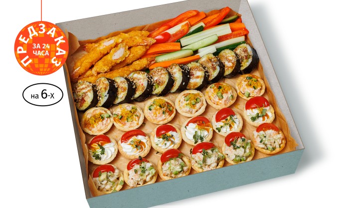 ПРЕДЗАКАЗ на завтра. Тарталетка с креветкой и авокадо 6 шт., Тарталетка с лососем в соусе лемонграсс 6 шт., Тарталетка со сливочным кремом и черри 6 шт., Кимпаб со снежным крабом 10 шт., Креветки панко 5 шт. с соусом, Свежие овощи