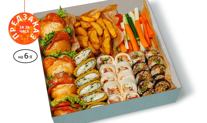 ПРЕДЗАКАЗ на завтра. Бургер с пепперони 5 шт., Кимпаб с цыпленком в соусе барбекю 10 шт., Ветчина в пшеничной тортилье 10 шт., Онигири с цыпленком 6 шт., Картофель по-деревенски, Свежие овощи