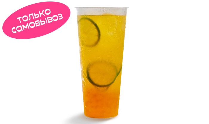 Черный чай, пюре персика, джусболлы, ломтики лайма/лимона, лед
