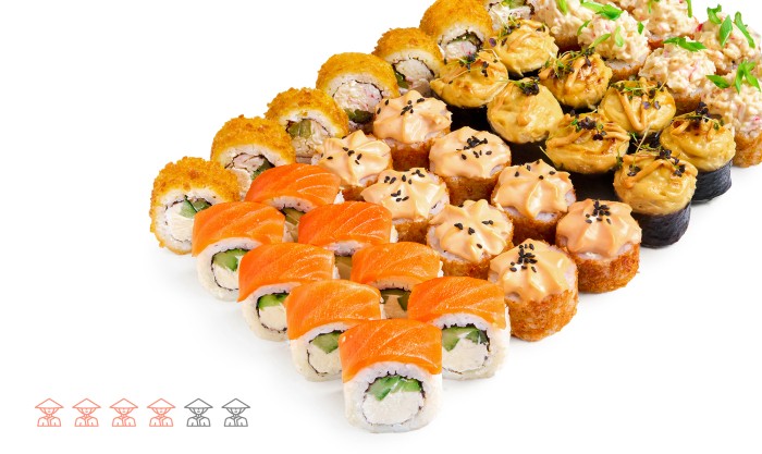 40 шт. Ролл Филадельфия с огурцом, ролл Креветка Конфетка, Запеченный ролл с креветкой, ролл Фреш Краб, ролл Калифорния Темпура