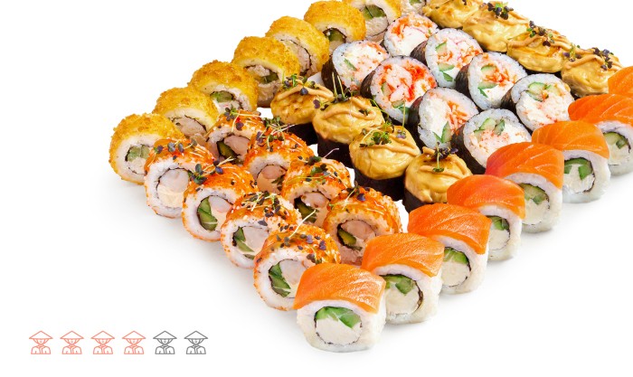 40 шт. Ролл Филадельфия с огурцом, ролл Калифорния с креветкой в соусе лемонграсс, Запеченный ролл с креветкой, ролл Калифорния Темпура, ролл Снежный краб в икре масаго