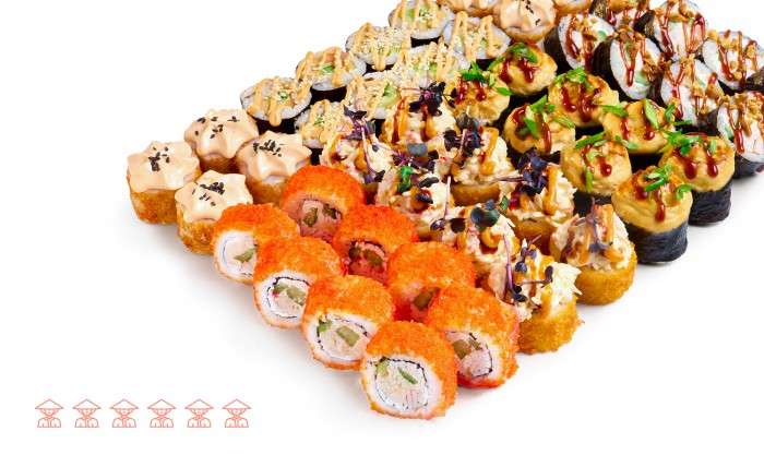 48 шт. Ролл Креветка Конфетка, ролл Калифорния, Запеченный ролл с копченым цыпленком, темпурный ролл Нежный краб в соусе том-ям, ролл Цыпленок в соусе барбекю, ролл Томаго Спайс