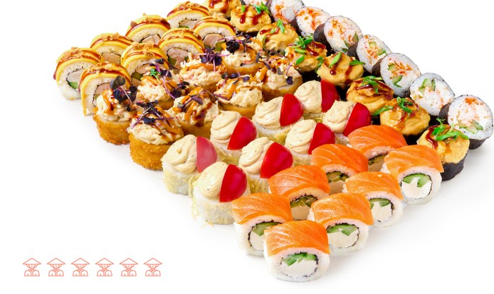 48 шт. Ролл Цезарь, ролл Филадельфия с огурцом, Запеченный ролл с копченым цыпленком, темпурный ролл Нежный краб в соусе том-ям, ролл Снежный краб в икре масаго, ролл Чикен-Чиз в соусе унаги