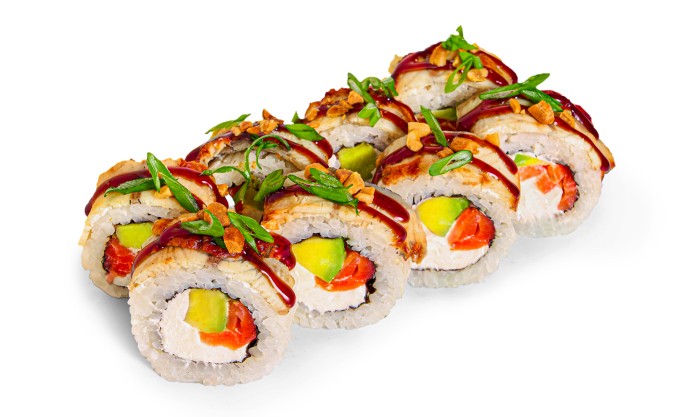 Копченый угорь, лосось, сливочный сыр, авокадо, соус унаги, кунжут