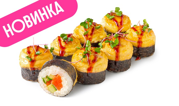Лосось, сливочный сыр, огурец, соус для запекания, соус тонкацу, микрозелень