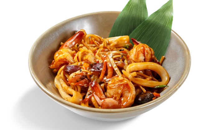 Лапша, томленая на курином бульоне, тигровые креветки, кальмары, морковь, цукини, шампиньоны, сладкий перец, сельдерей, устричный соус, красный лук, кунжут, чеснок, имбирь