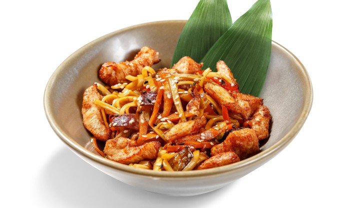 Лапша, томленая на курином бульоне, куриное филе, морковь, цукини, шампиньоны, сладкий перец, сельдерей, соус терияки, красный лук, кунжут, чеснок, имбирь