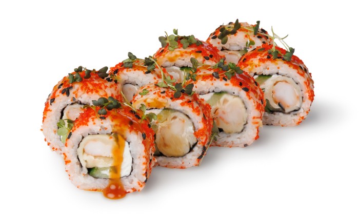 Тигровая креветка, сливочный сыр, огурец, икра масаго, соус лемонграсс, кунжут, микрозелень