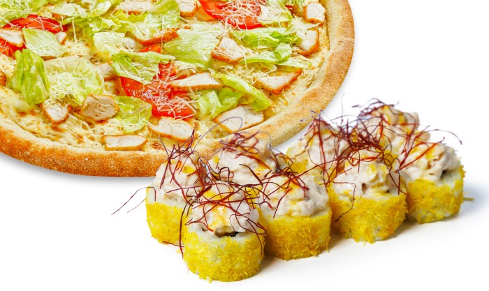Пицца Цезарь 25 см + Ролл Гавайский в соусе ананас-чили